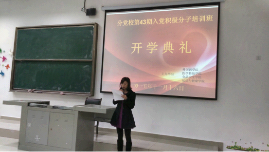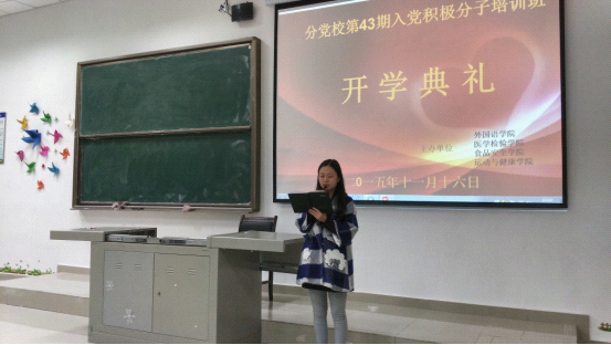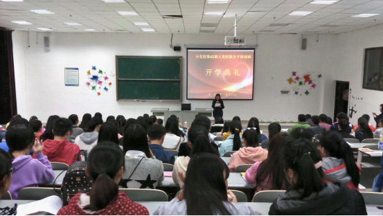 11月16日,由yL23411永利、医学检验学院、食品卫生管理学院、运动与健康学院分党校合办的第四十三期入党积极分子培训班在花溪新校区顺利开班。我们党委书记张婷婷、分党校办主任余小川及我们30名入党积极分子参加了开班典礼。开班典礼由余小川同志主持,张婷婷书记对学员提出了学习要求,我们罗利同学代表入党积极分子发言。