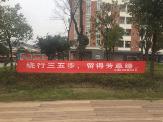 二是以“绕行三五步,留得芳草绿”为主题的校园环境保护活动。分团委组织我们各班团支部到一食堂广场,通过展示横幅、宣讲等方式呼吁同学们爱护校园环境,不要随意践踏草坪。只要同学们都自觉“绕行三五步”,为校园环境出一份力,便可少一个足迹多一份绿意,换来美丽舒适的校园。