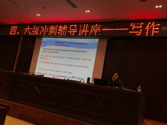 2017年4月26日下午,吴军莉老师在道德讲堂开展了《四、六级冲刺辅导讲座——写作》。开始,吴老师就强调了一篇好的作文需要Organization,Content,Language三个要点,提出了作文需要生动的文字选择和令人愉快的风格。期间,吴老师结合对PPT的范文和语句上的分析,对学生提出了几点:1,多使用高级字。2,注重谓词形式的使用。3,要使用过渡连接表达式。4,多加强多态表达。5,聚焦句子变换。