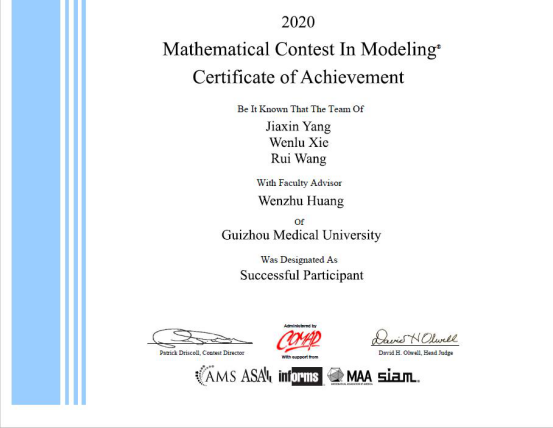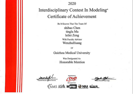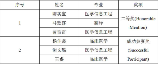 本次参赛学生的培训工作自2019年3月启动,参赛学生们克服疫情影响,克服重重困难通过线上学习,在指导老师悉心指导下,为最终取得优异成绩打下良好基础。本次竞赛充分展示了我们学子扎实的数学应用能力和勇于进取的决心和毅力,同时也体现了我们老师爱岗敬业的优秀师德师风,彰显了我们师生在国际舞台上的钻研和探索精神,有效推动了数学科学与其他学科间的深度融合,为培养研究型医学人才创造了良好的氛围。